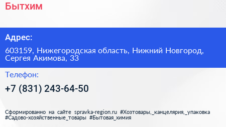 Бытхим по адресу 603159, Нижегородская область, Нижний Новгород, Сергея Акимова, 33 в дальнейшем Организация, размещена в следующих категориях: