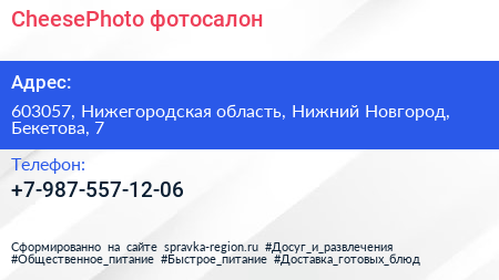 CheesePhoto, фотосалон по адресу 603057, Нижегородская область, Нижний Новгород, Бекетова, 7 в дальнейшем Организация, размещена в следующих категориях:
