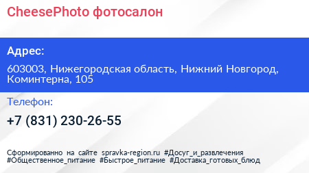 CheesePhoto, фотосалон по адресу 603003, Нижегородская область, Нижний Новгород, Коминтерна, 105 в дальнейшем Организация, размещена в следующих категориях: