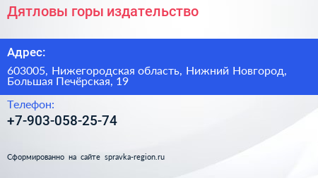 Дятловы горы, издательство по адресу 603005, Нижегородская область, Нижний Новгород, Большая Печёрская, 19 в дальнейшем Организация, размещена в следующих категориях: