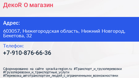 ДекоR & O, магазин по адресу 603057, Нижегородская область, Нижний Новгород, Бекетова, 32 в дальнейшем Организация, размещена в следующих категориях: