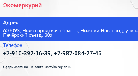 Экомеркурий по адресу 603093, Нижегородская область, Нижний Новгород, улица Печёрский съезд, 38а в дальнейшем Организация, размещена в следующих категориях: