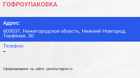 ГОФРОУПАКОВКА по адресу 603037, Нижегородская область, Нижний Новгород, Торфяная, 30 в дальнейшем Организация, размещена в следующих категориях:
