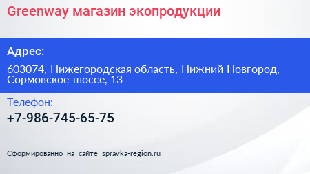 Greenway, магазин экопродукции по адресу 603074, Нижегородская область, Нижний Новгород, Сормовское шоссе, 13 в дальнейшем Организация, размещена в следующих категориях: