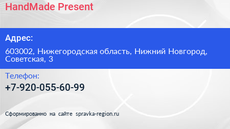HandMade Present по адресу 603002, Нижегородская область, Нижний Новгород, Советская, 3 в дальнейшем Организация, размещена в следующих категориях: