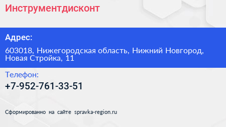 Инструментдисконт по адресу 603018, Нижегородская область, Нижний Новгород, Новая Стройка, 11 в дальнейшем Организация, размещена в следующих категориях: