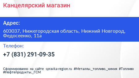 Канцелярский магазин по адресу 603037, Нижегородская область, Нижний Новгород, Федосеенко, 11а в дальнейшем Организация, размещена в следующих категориях: