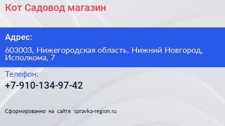 Кот-Садовод, магазин по адресу 603003, Нижегородская область, Нижний Новгород, Исполкома, 7 в дальнейшем Организация, размещена в следующих категориях: