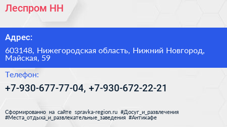 Леспром-НН по адресу 603148, Нижегородская область, Нижний Новгород, Майская, 59 в дальнейшем Организация, размещена в следующих категориях: