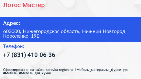 Лотос Мастер по адресу 603000, Нижегородская область, Нижний Новгород, Короленко, 19Б в дальнейшем Организация, размещена в следующих категориях: