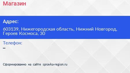Магазин по адресу 603139, Нижегородская область, Нижний Новгород, Героев Космоса, 30 в дальнейшем Организация, размещена в следующих категориях: