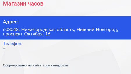 Магазин часов по адресу 603043, Нижегородская область, Нижний Новгород, проспект Октября, 16 в дальнейшем Организация, размещена в следующих категориях:
