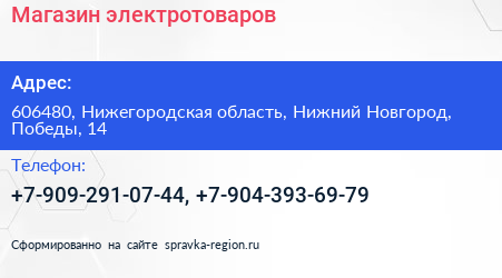Магазин электротоваров по адресу 606480, Нижегородская область, Нижний Новгород, Победы, 14 в дальнейшем Организация, размещена в следующих категориях: