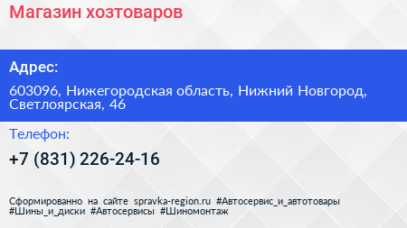 Магазин хозтоваров по адресу 603096, Нижегородская область, Нижний Новгород, Светлоярская, 46 в дальнейшем Организация, размещена в следующих категориях: