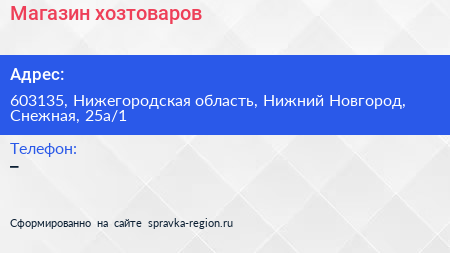 Магазин хозтоваров по адресу 603135, Нижегородская область, Нижний Новгород, Снежная, 25а/1 в дальнейшем Организация, размещена в следующих категориях: