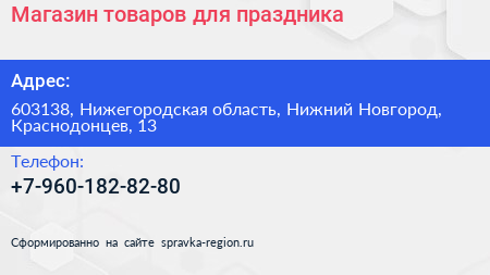Магазин товаров для праздника по адресу 603138, Нижегородская область, Нижний Новгород, Краснодонцев, 13 в дальнейшем Организация, размещена в следующих категориях: