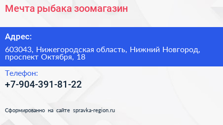 Мечта рыбака, зоомагазин по адресу 603043, Нижегородская область, Нижний Новгород, проспект Октября, 18 в дальнейшем Организация, размещена в следующих категориях: