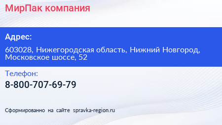 МирПак, компания по адресу 603028, Нижегородская область, Нижний Новгород, Московское шоссе, 52 в дальнейшем Организация, размещена в следующих категориях: