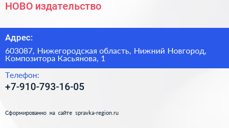 НОВО, издательство по адресу 603087, Нижегородская область, Нижний Новгород, Композитора Касьянова, 1 в дальнейшем Организация, размещена в следующих категориях: