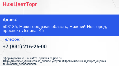 НижЦветТорг по адресу 603135, Нижегородская область, Нижний Новгород, проспект Ленина, 45 в дальнейшем Организация, размещена в следующих категориях: