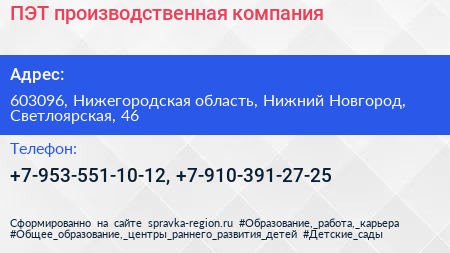 ПЭТ, производственная компания по адресу 603096, Нижегородская область, Нижний Новгород, Светлоярская, 46 в дальнейшем Организация, размещена в следующих категориях: