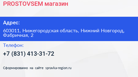 PROSTOVSEM, магазин по адресу 603011, Нижегородская область, Нижний Новгород, Фабричная, 2 в дальнейшем Организация, размещена в следующих категориях: