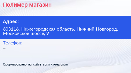 Полимер, магазин по адресу 603116, Нижегородская область, Нижний Новгород, Московское шоссе, 9 в дальнейшем Организация, размещена в следующих категориях: