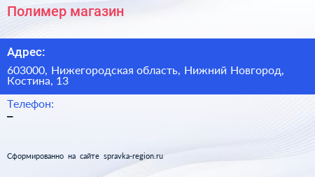 Полимер, магазин по адресу 603000, Нижегородская область, Нижний Новгород, Костина, 13 в дальнейшем Организация, размещена в следующих категориях: