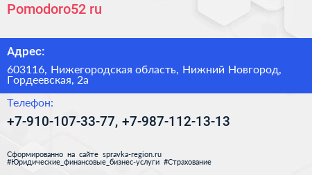 Pomodoro52.ru по адресу 603116, Нижегородская область, Нижний Новгород, Гордеевская, 2а в дальнейшем Организация, размещена в следующих категориях: