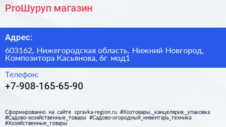 ProШуруп, магазин по адресу 603162, Нижегородская область, Нижний Новгород, Композитора Касьянова, 6г мод1 в дальнейшем Организация, размещена в следующих категориях: