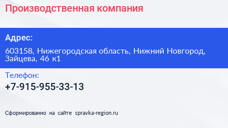 Производственная компания по адресу 603158, Нижегородская область, Нижний Новгород, Зайцева, 46 к1 в дальнейшем Организация, размещена в следующих категориях: