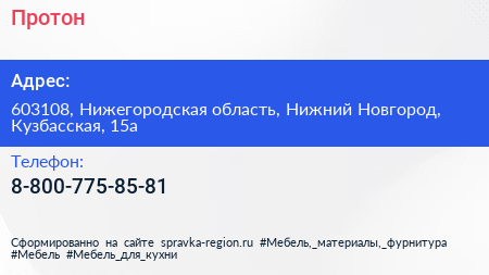 Протон по адресу 603108, Нижегородская область, Нижний Новгород, Кузбасская, 15а в дальнейшем Организация, размещена в следующих категориях: