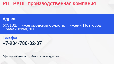 РП-ГРУПП, производственная компания по адресу 603132, Нижегородская область, Нижний Новгород, Правдинская, 10 в дальнейшем Организация, размещена в следующих категориях:
