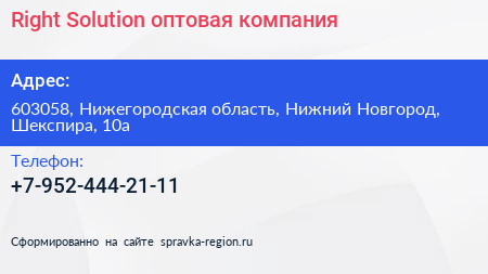 Right Solution, оптовая компания по адресу 603058, Нижегородская область, Нижний Новгород, Шекспира, 10а в дальнейшем Организация, размещена в следующих категориях: