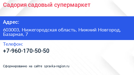 Садория, садовый супермаркет по адресу 603003, Нижегородская область, Нижний Новгород, Базарная, 7 в дальнейшем Организация, размещена в следующих категориях: