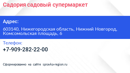 Садория, садовый супермаркет по адресу 603140, Нижегородская область, Нижний Новгород, Комсомольская площадь, 6 в дальнейшем Организация, размещена в следующих категориях: