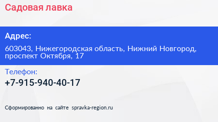 Садовая лавка по адресу 603043, Нижегородская область, Нижний Новгород, проспект Октября, 17 в дальнейшем Организация, размещена в следующих категориях: