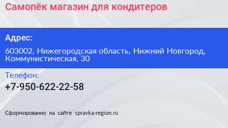 Самопёк, магазин для кондитеров по адресу 603002, Нижегородская область, Нижний Новгород, Коммунистическая, 30 в дальнейшем Организация, размещена в следующих категориях: