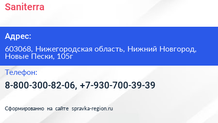 Saniterra по адресу 603068, Нижегородская область, Нижний Новгород, Новые Пески, 105г в дальнейшем Организация, размещена в следующих категориях: