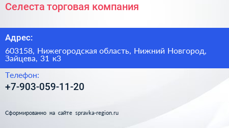 Селеста, торговая компания по адресу 603158, Нижегородская область, Нижний Новгород, Зайцева, 31 к3 в дальнейшем Организация, размещена в следующих категориях: