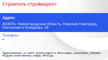 Строитель, строймаркет по адресу 603076, Нижегородская область, Нижний Новгород, Космонавта Комарова, 18 в дальнейшем Организация, размещена в следующих категориях: