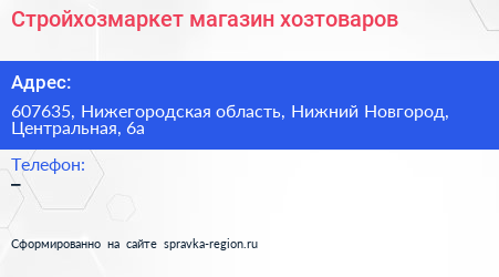 Стройхозмаркет, магазин хозтоваров по адресу 607635, Нижегородская область, Нижний Новгород, Центральная, 6а в дальнейшем Организация, размещена в следующих категориях: