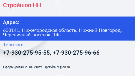 Стройшоп НН по адресу 603141, Нижегородская область, Нижний Новгород, Черепичный посёлок, 14в в дальнейшем Организация, размещена в следующих категориях:
