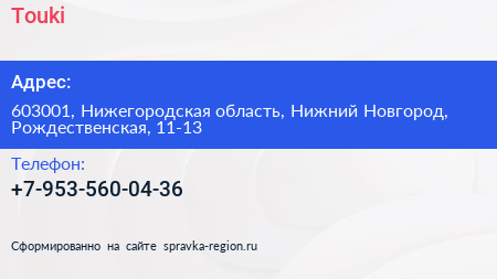 Touki по адресу 603001, Нижегородская область, Нижний Новгород, Рождественская, 11-13 в дальнейшем Организация, размещена в следующих категориях: