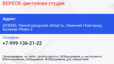 ВЕРЕСК, цветочная студия по адресу 603000, Нижегородская область, Нижний Новгород, Бульвар Мира 2 в дальнейшем Организация, размещена в следующих категориях: