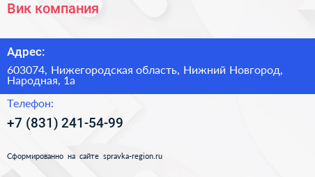 Вик, компания по адресу 603074, Нижегородская область, Нижний Новгород, Народная, 1а в дальнейшем Организация, размещена в следующих категориях: