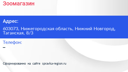 Зоомагазин по адресу 603073, Нижегородская область, Нижний Новгород, Таганская, 8/3 в дальнейшем Организация, размещена в следующих категориях: