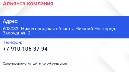 Альянса, компания по адресу 603033, Нижегородская область, Нижний Новгород, Запрудная, 2 в дальнейшем Организация, размещена в следующих категориях: