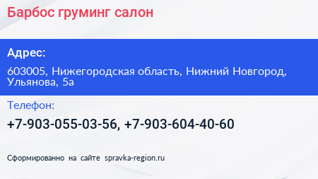 Барбос, груминг-салон по адресу 603005, Нижегородская область, Нижний Новгород, Ульянова, 5а в дальнейшем Организация, размещена в следующих категориях: