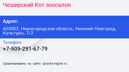 Чеширский Кот, зоосалон по адресу 603003, Нижегородская область, Нижний Новгород, Культуры, 7/2 в дальнейшем Организация, размещена в следующих категориях: